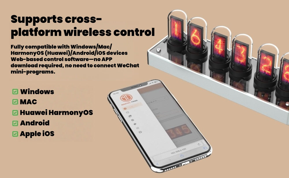 Seamlessly control your clock from Windows, Mac, HarmonyOS, Android, and iOS via a web interface—no app or WeChat Mini Program required. Adjust time zones, set alarms, switch display modes, and customize clock faces, all from your favorite device.